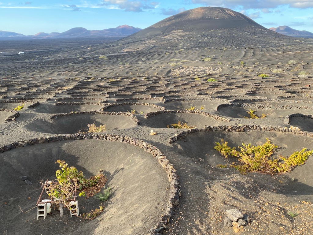 wine fields Along sandy black gravel roads through endless wine plantations, always with a couple of old volcanos in the distance.