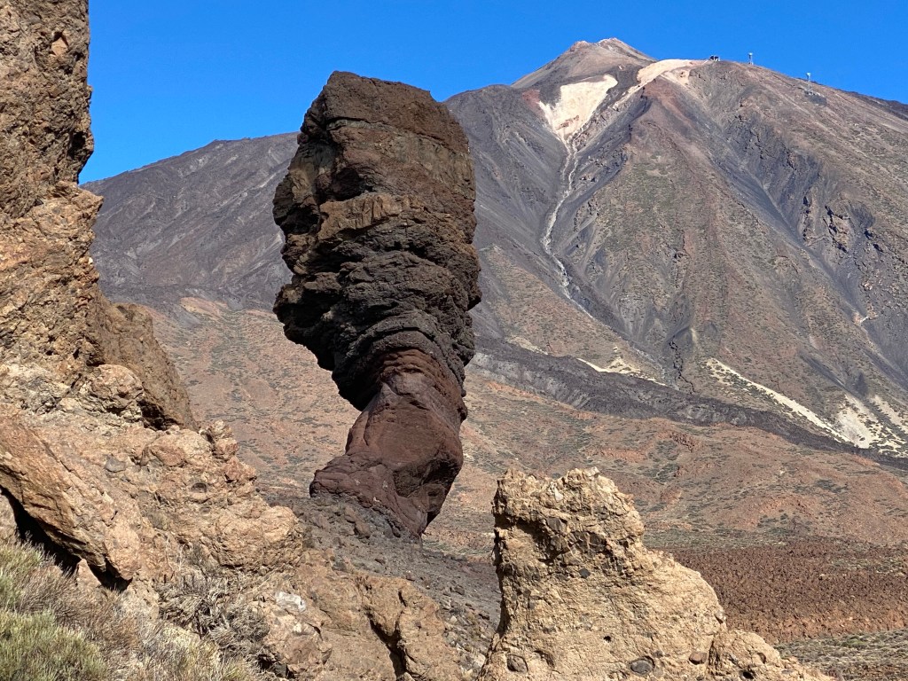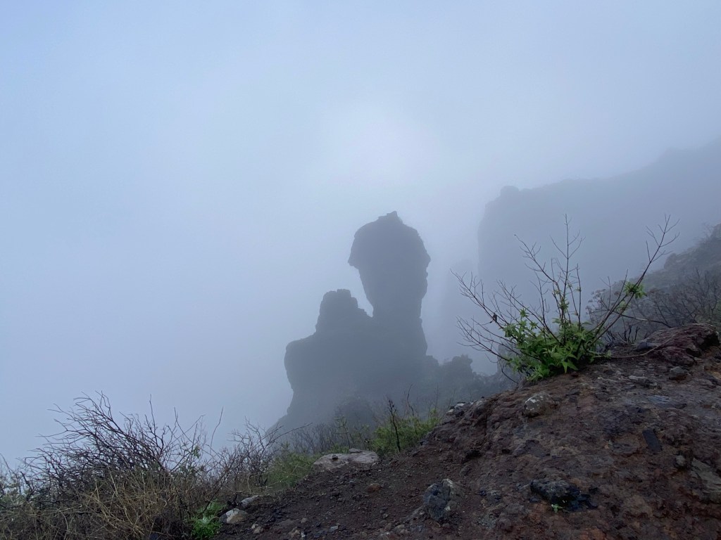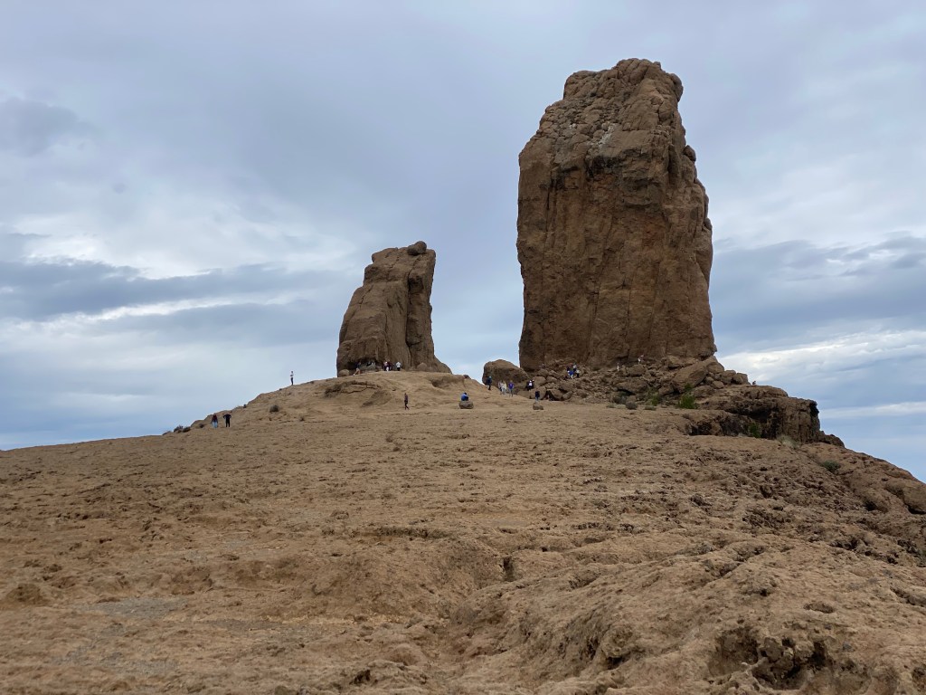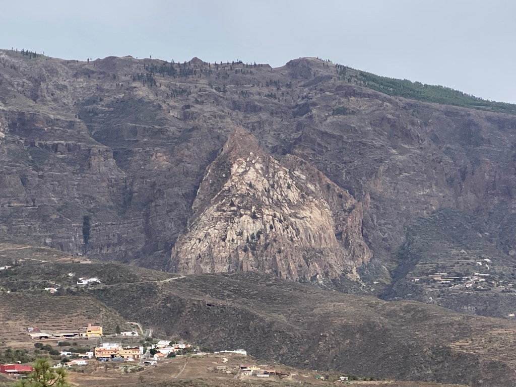 Roque Cinchado According to the sign this ‘guy’ (and several similar rocks around there), where once the centre of a volcanic conduit. When the magma there cooled down slowly, it formed a special type of very resistant rock. Now everything else of the volcano is eroded, just the solidified central conduit remains.