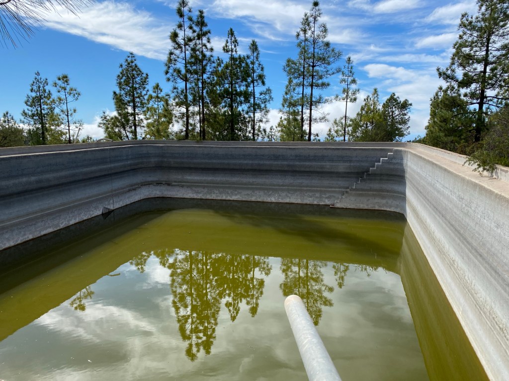 view down onto the stone bridge crossing Barranco del Rey There is a beautiful open water tank.