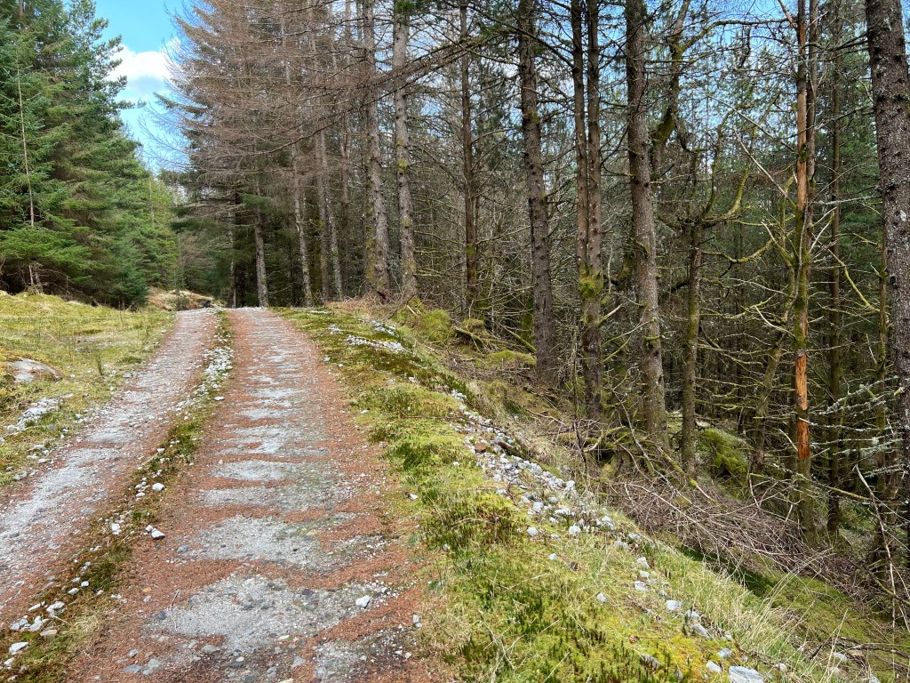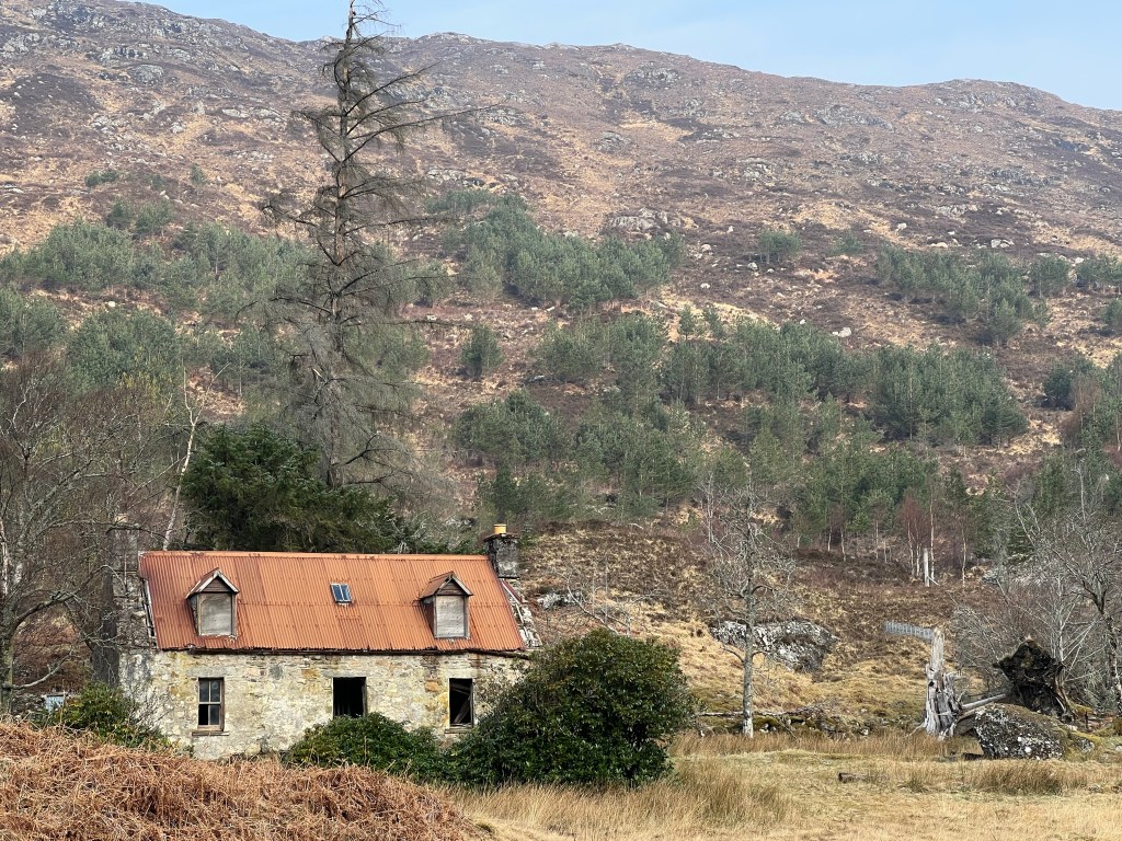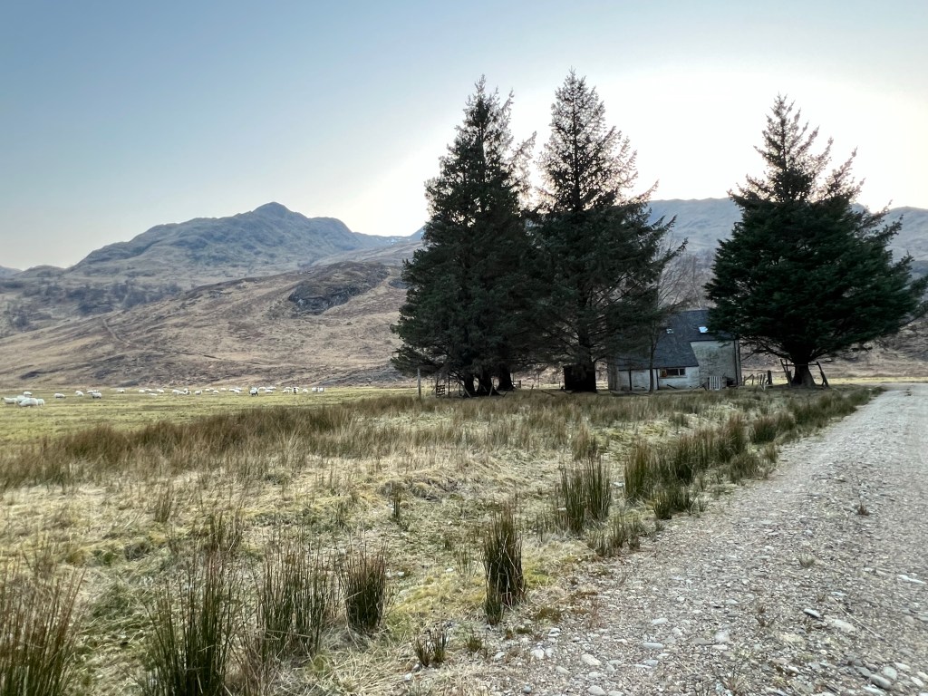 Glendessary woods Following that road, and passing Strathan and Glendessary farms only in the distance, and meeting one friendly biker, I get to A’Chuil Bothy quite quickly – despite the backback starting to feel real heavy. I have a chat with a guy and his two curious dogs, and a look into the bothy, but decide to press on for a little bit more.