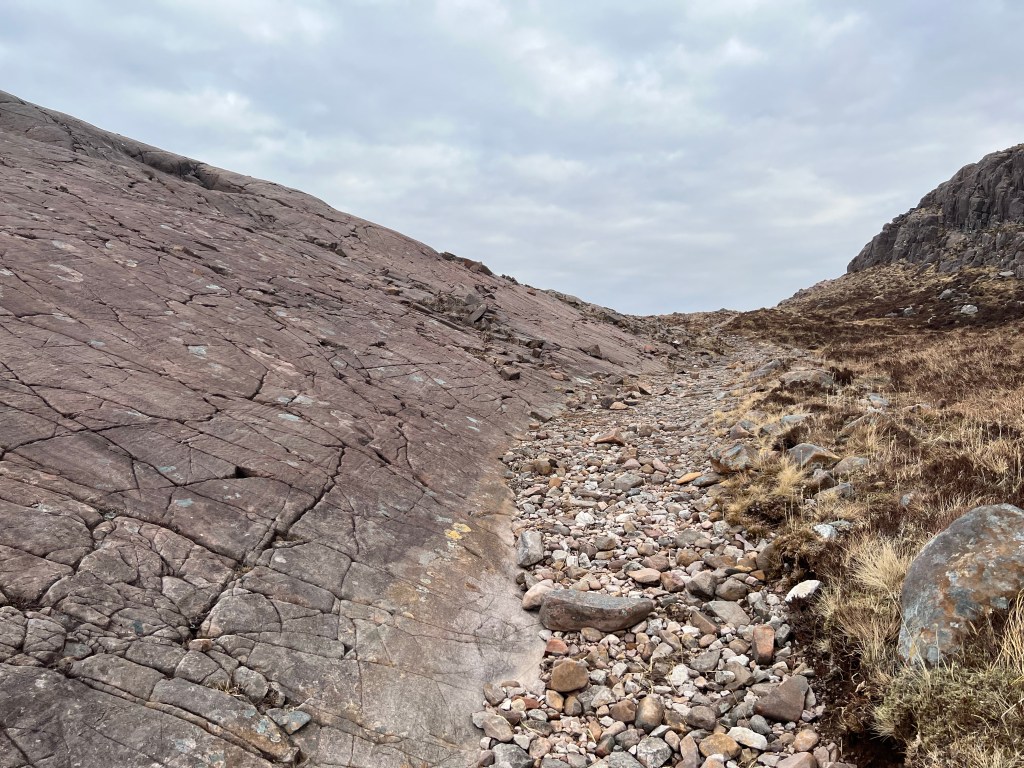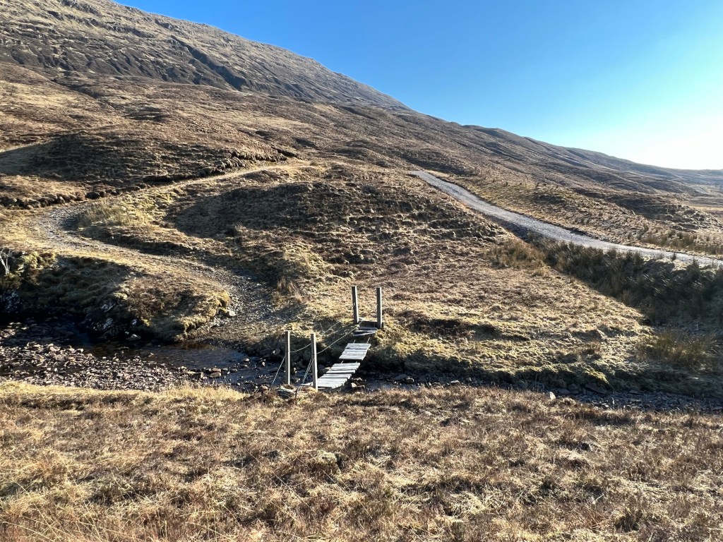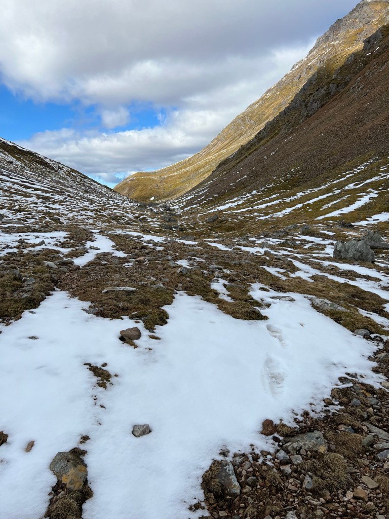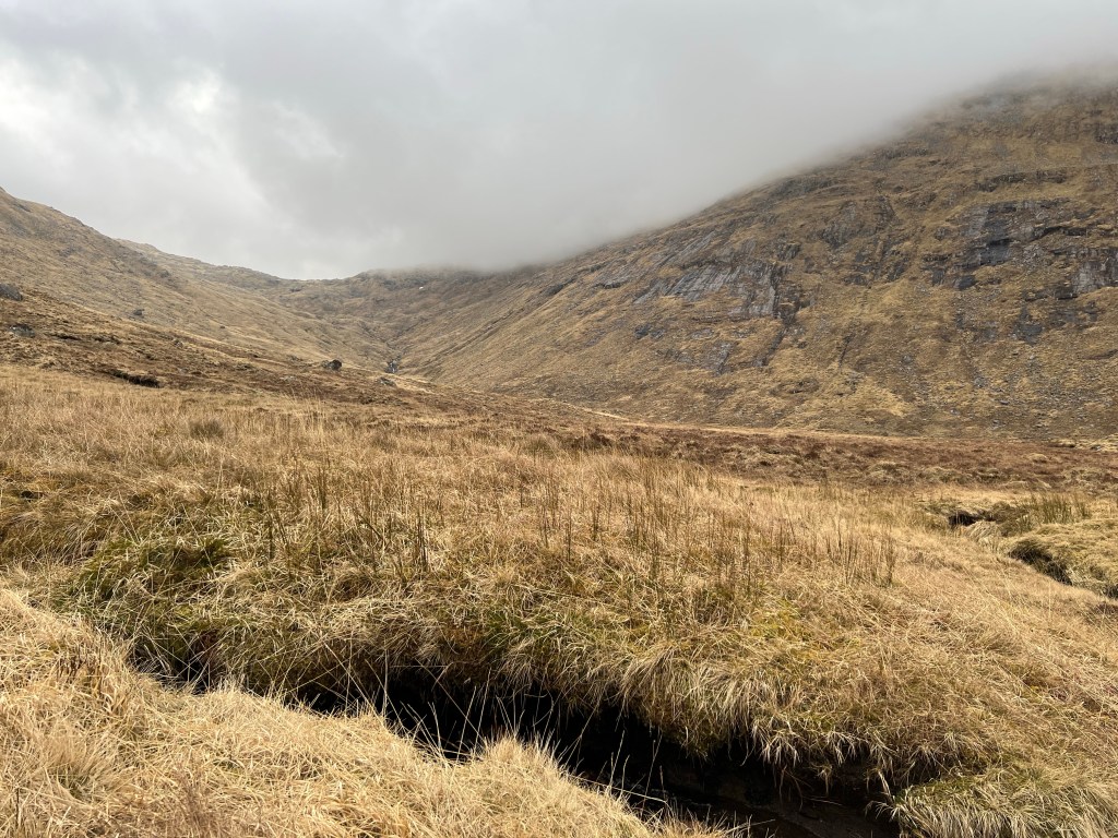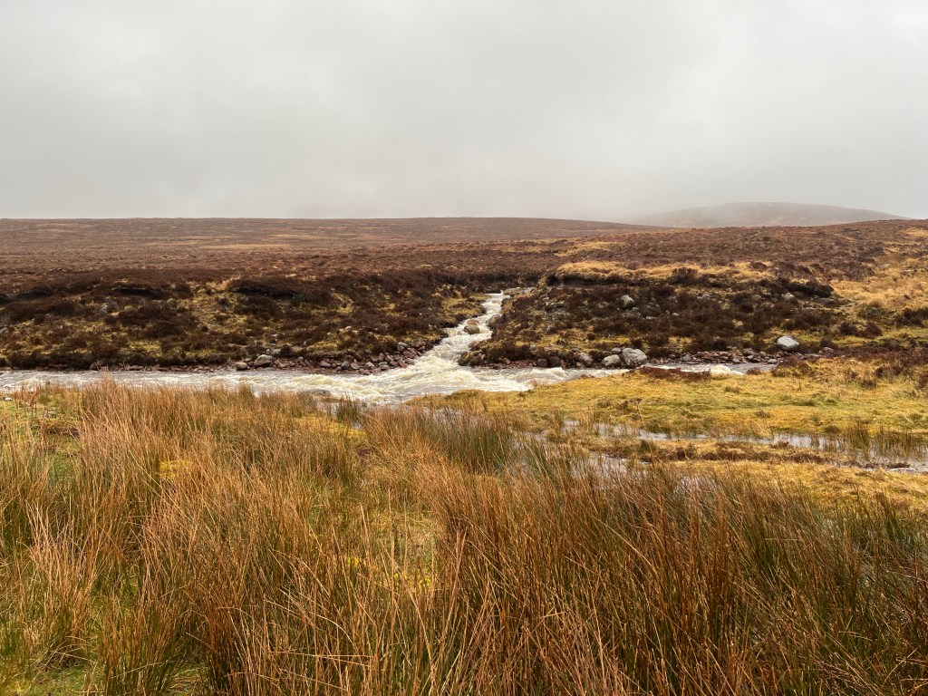 Corryhully Then the 4-wheel-drive tracks rise steeper up the sidevalley, before it transforms into just a faint single path. There is also the first unbridged rivercrossings, but with my hiking poles for balance, I manage to keep dry feet – for now. Reaching the ‘saddle’ – Bealach Allt n’ Chaoruinn, it flattens out and gets boggy… no way to keep feets dry here.