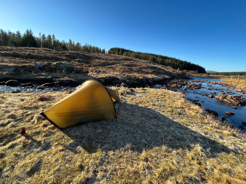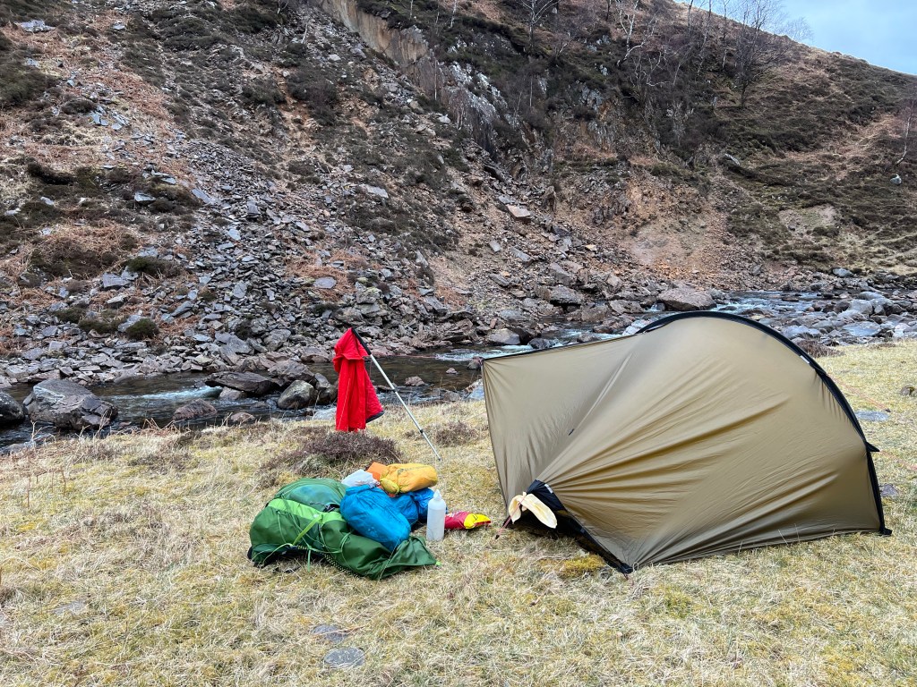 A’Chuil bothy I set up my tent at an open river bend, just near the path. Three more hikers pass by, bringing the total of people met today (after leaving the tourists at the viaduct) to 5.