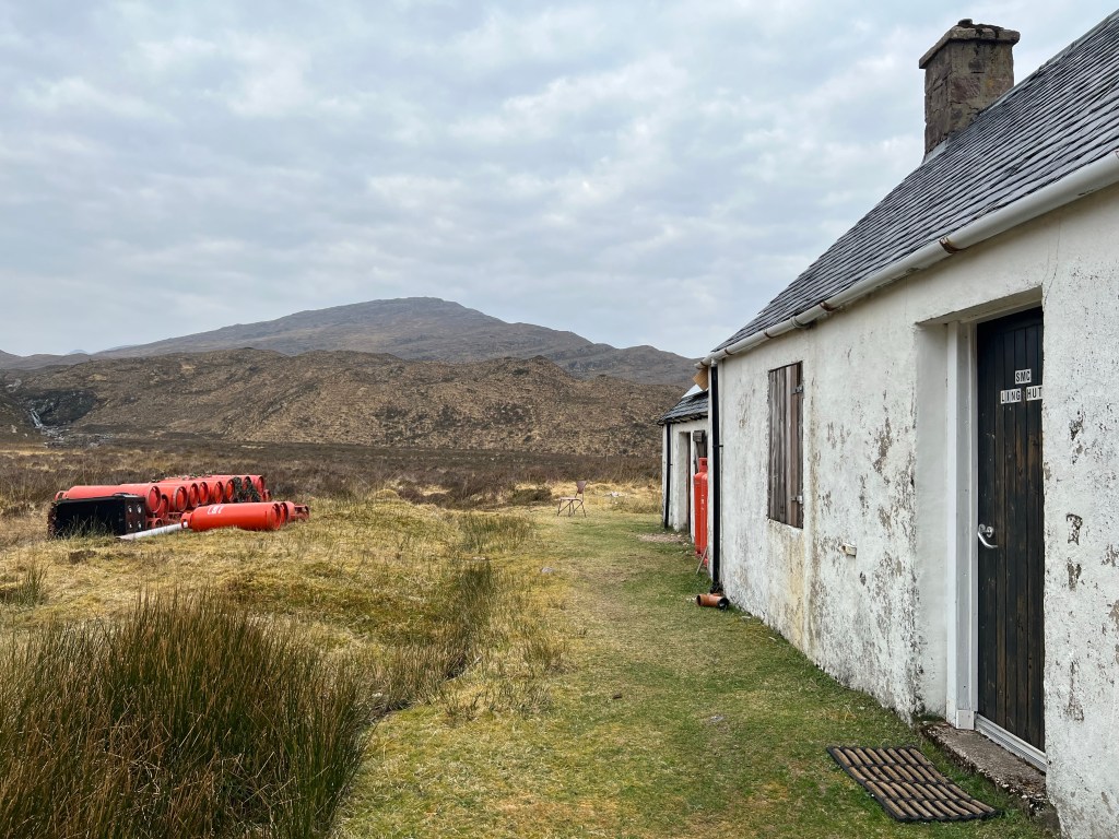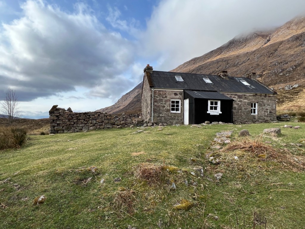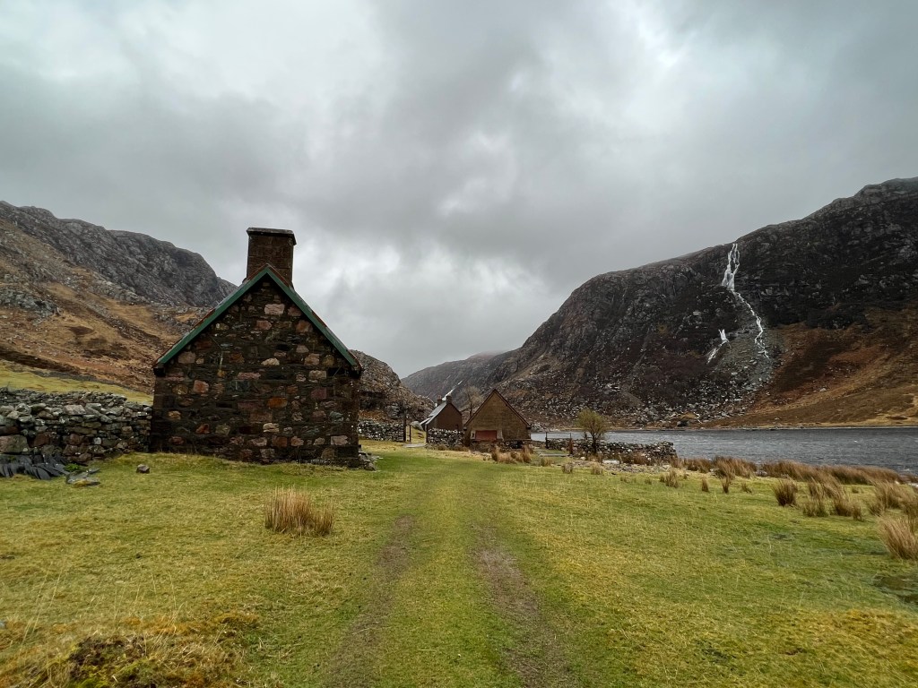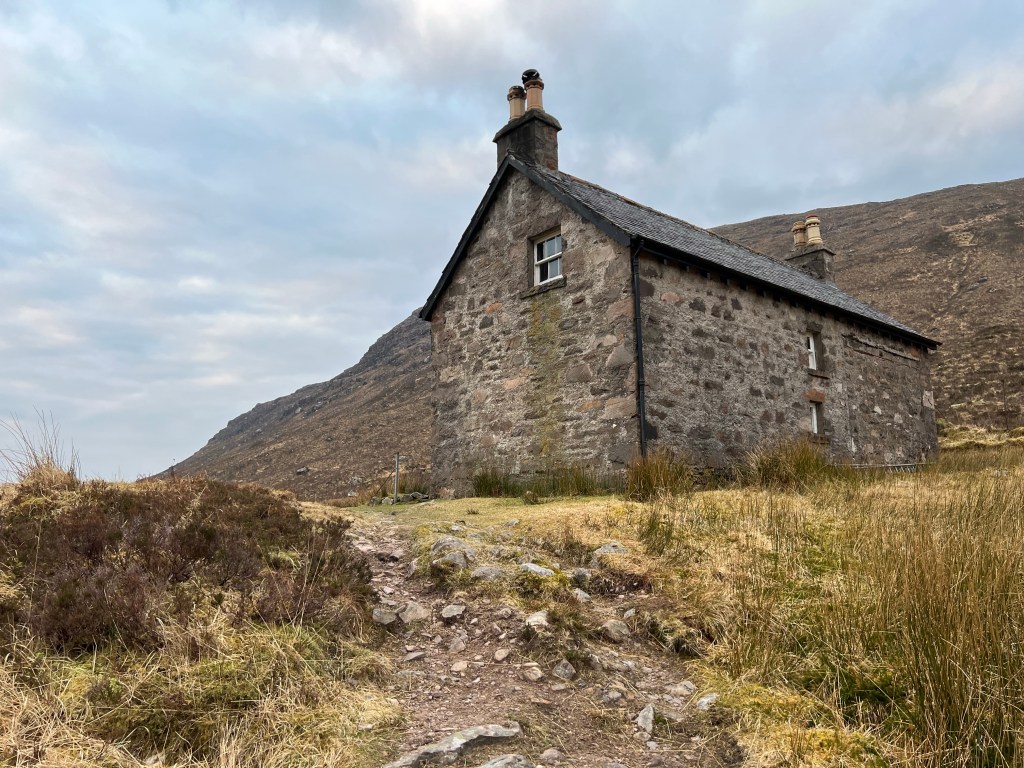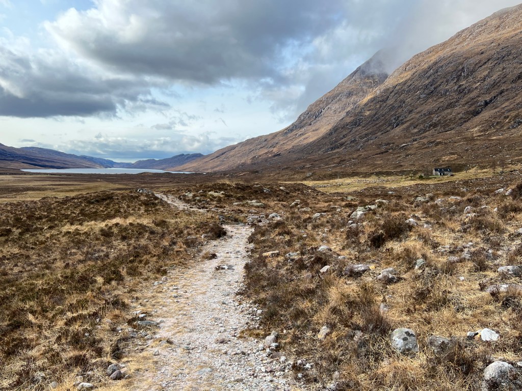 leaving Strathchailleach bothy under big and stormy rain / sleet clouds