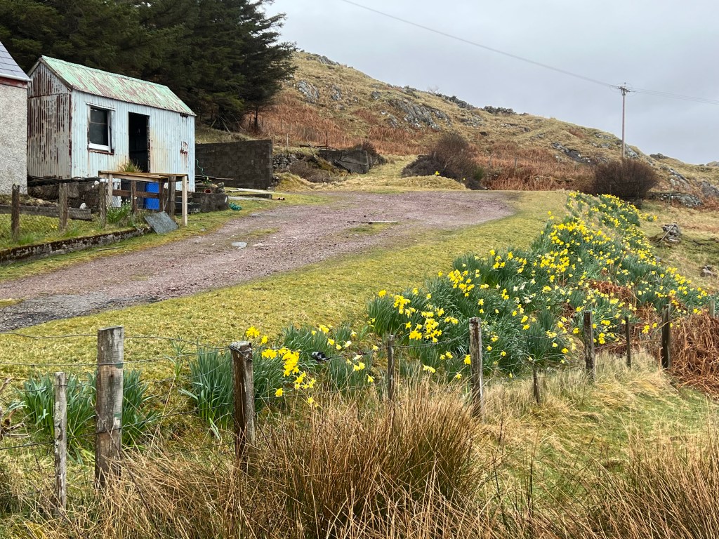 Glenfinnan railway viaduct Passing some last couple of houses, with garden full of daphodils. A reminder of the roadsides around Glasgow: were full of them, so beautiful; but I didn’t manage a good picture from the bus.