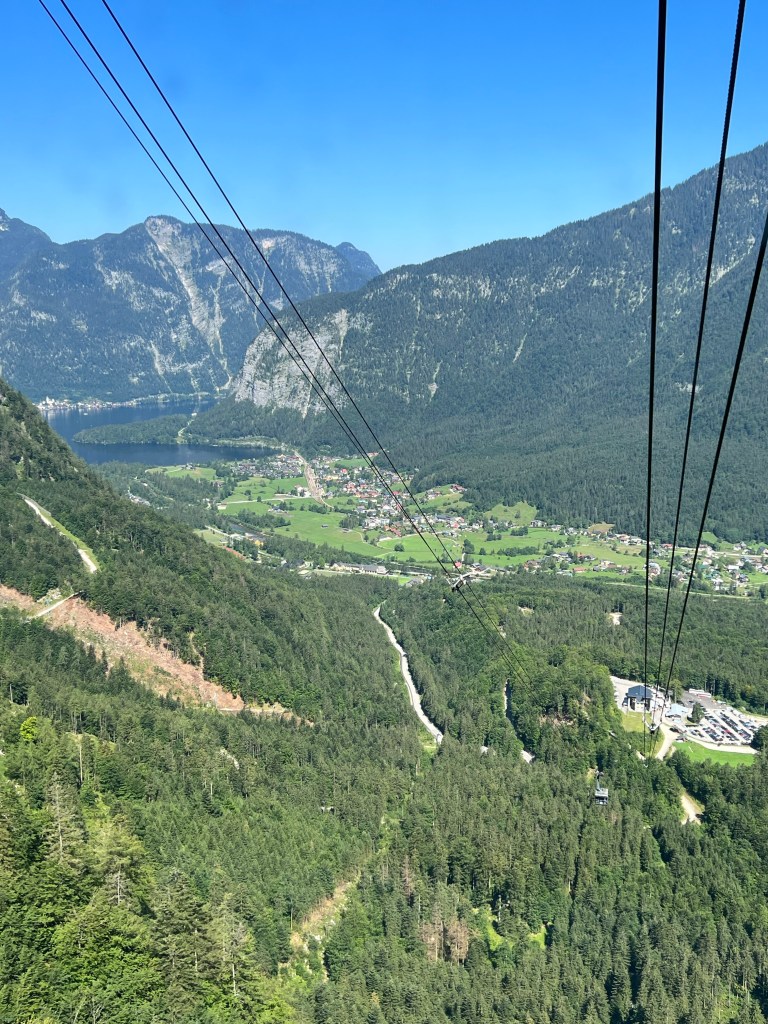 From the cable car we get a beautiful view back onto Obertraun, the Hallstätter See, and famous Hallstatt with its Salzberg on the other side of the lake.